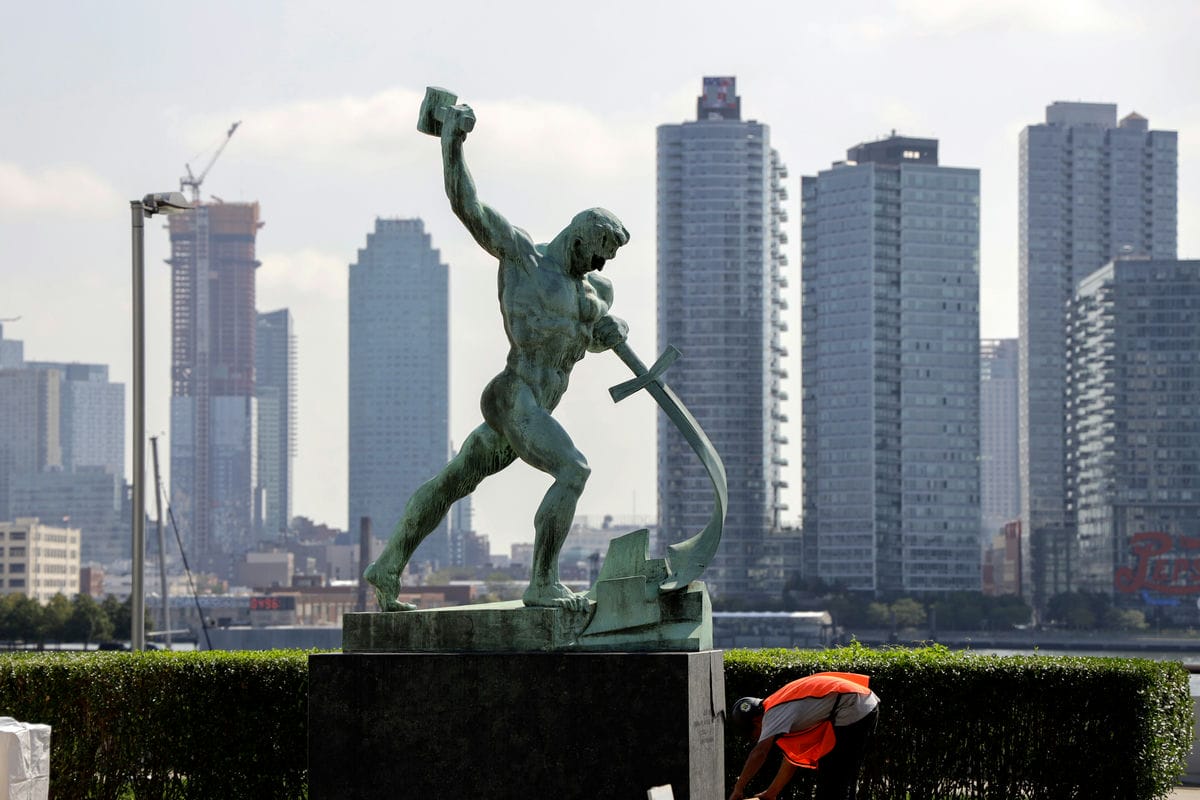 这是2019年9月11日在位于纽约的联合国总部拍摄的雕塑“铸剑为犁”。凯发k8官网记者 李木子 摄